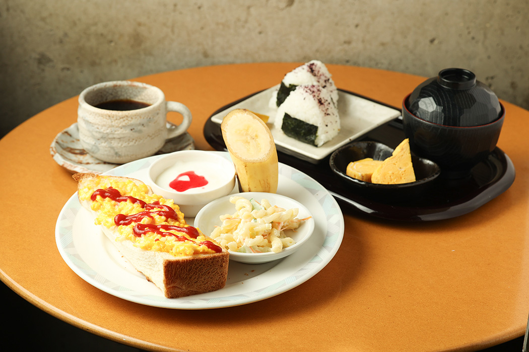 A.バタートースト(ジャム・小倉・シナモン)+サラダ+ヨーグルト+ゆで玉子or茶わん蒸し B.サンドイッチ+サラダ+ヨーグルト+フルーツ C.ホットドック(ウィンナー)+サラダ+ヨーグルト+フルーツ D.エッグトースト(つぶし玉子)+サラダ+ヨーグルト+フルーツ E.おにぎり+たまご焼き+つけもの+みそ汁 ☆お子様モーニング ホットドックorホットケーキ+ドリンク ※月曜日のみサンドイッチではなくごまパントーストになります