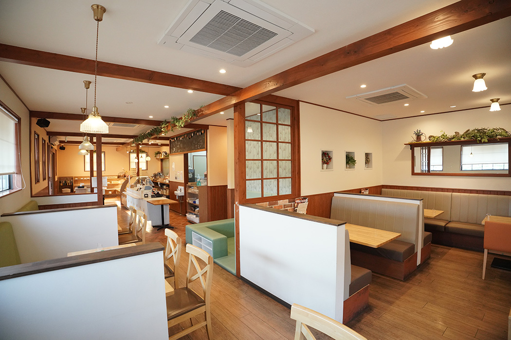 誰もが入り易い、家庭的な店。 毎日50種類以上の生ケーキを製造・販売しており、バースデーケーキや焼き菓子も豊富に取り揃えています。カフェでは、選べるモーニングやお好きなパンとケーキが選べるランチセット、お得なケーキセットも充実しています。 自家製パンのテイクアウトも好評で、店内は60席と広々としており、キッズスペースも完備されています。