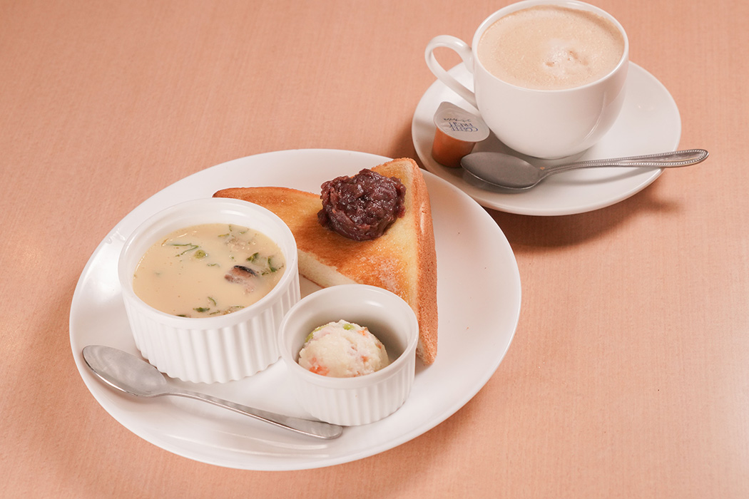 ●小倉トースト+手作り茶碗蒸し+日替り品 ●フレンチトースト+手作り茶碗蒸し+日替り品 ●焼きサンドイッチ+手作り茶碗蒸し+日替り品 ●エッグドック+手作り茶碗蒸し+日替り品 ●バタートースト+手作り茶碗蒸し+日替り品 ●ピザトースト+手作り茶碗蒸し+日替り品