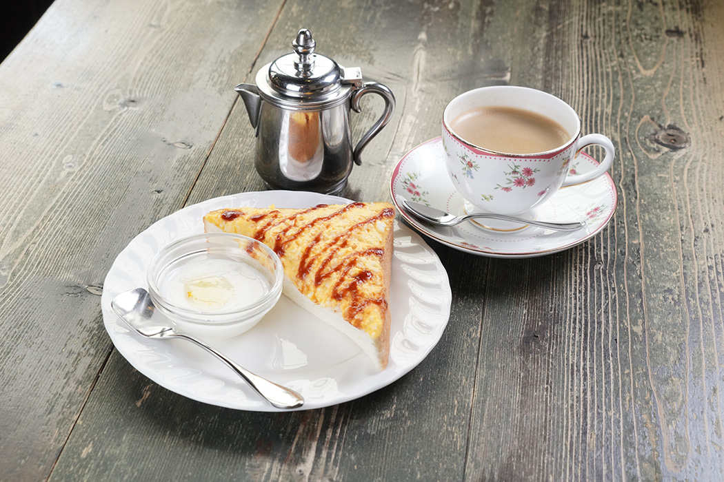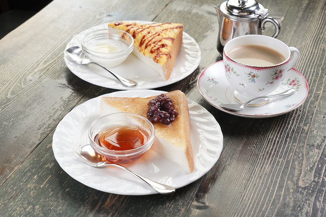 ・エッグトースト ・バタートースト ・ジャムトースト ・ 小倉トースト ・メープルトースト ・シナモントースト 上記にもう一品 ヨーグルトor紅茶ゼリー