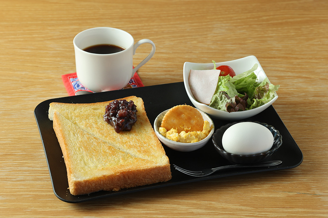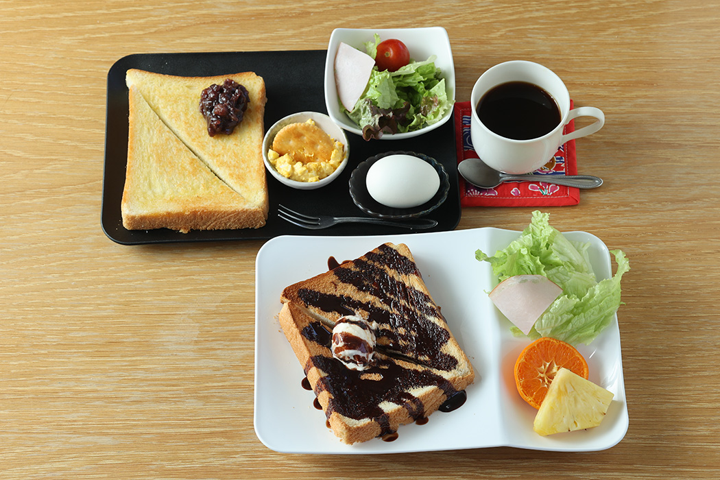 ・(おにぎりセット)おにぎり3つ+お漬物+ゆで卵+サラダ(上記写真・土日祝限定) ・(モコマルセット)トースト1枚(トッピング有)+サラダ+ゆで卵+日替り1品 ・(モコセット)チーズはちみつトースト+サラダ+フルーツ ・(マルセット)アイスのせトースト(チョコソース)+サラダ+フルーツ