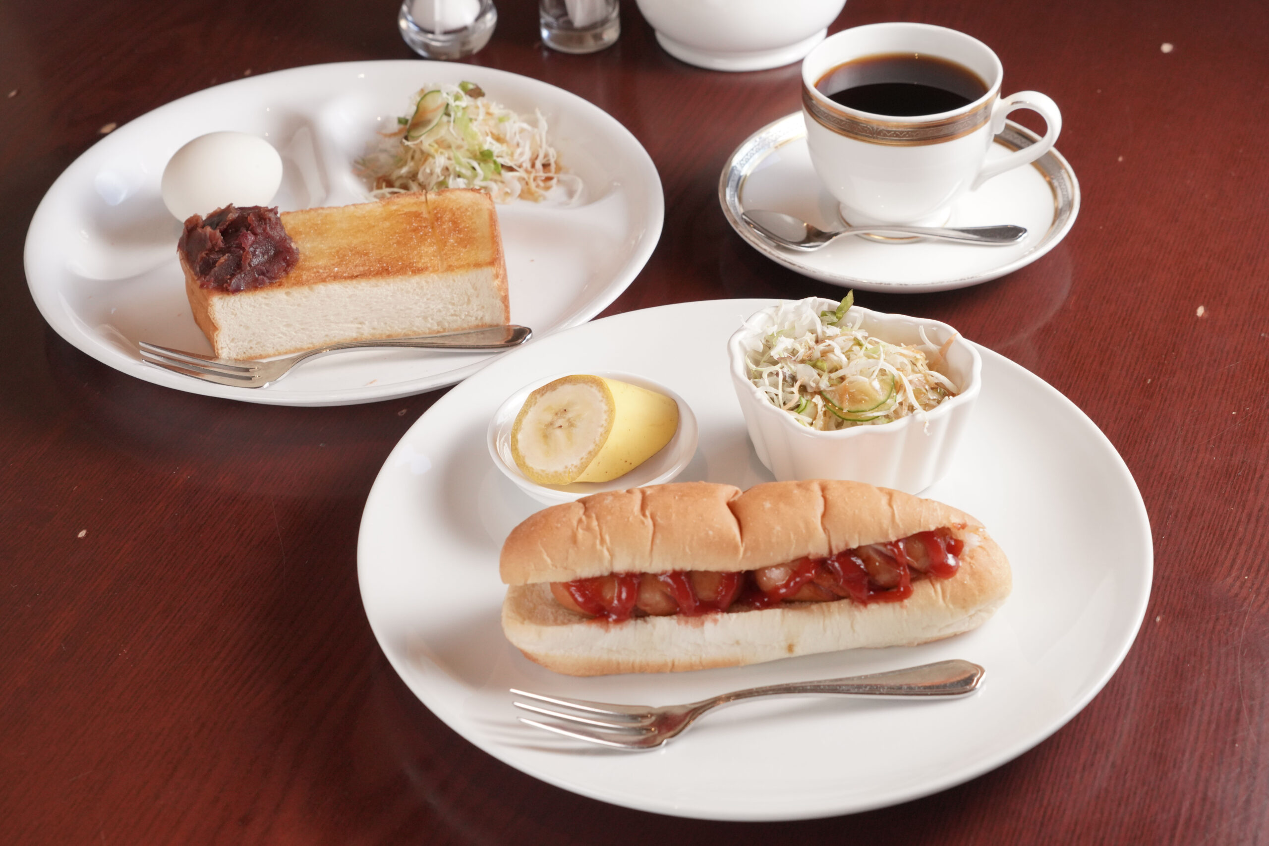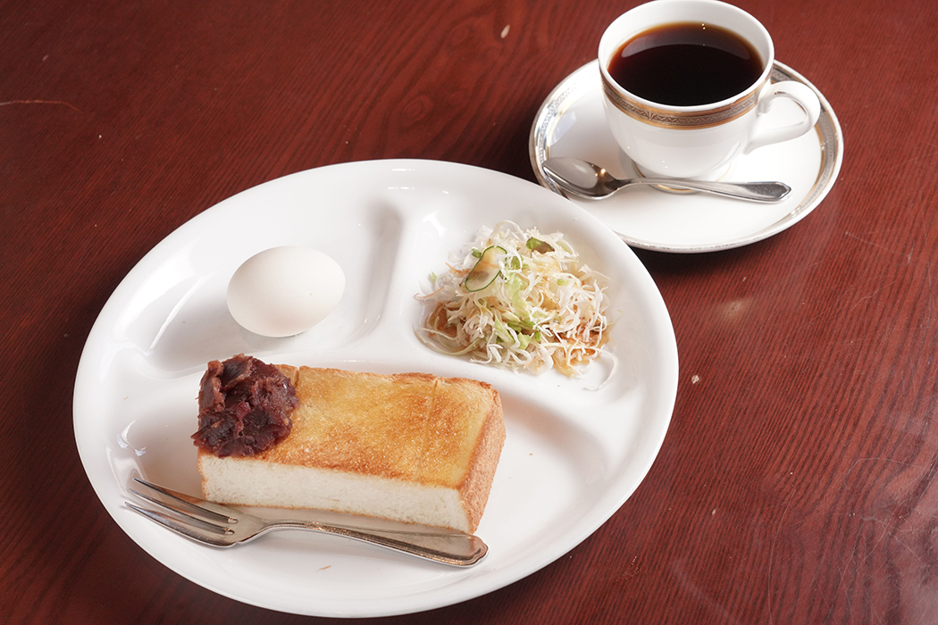 A厚切りトースト(※)+フレッシュサラダ+ゆで卵 ※黒糖パンか白食パンのいずれかを選び、バター・小倉・マーマレード・イチゴジャム・シナモンから1つをトッピング Bたまごサンドorフレンチトースト(どちらか1つ)+フルーツ+フレッシュサラダ トースト、フレンチトースト倍増(+150円)、ホットドッグ(+250円)