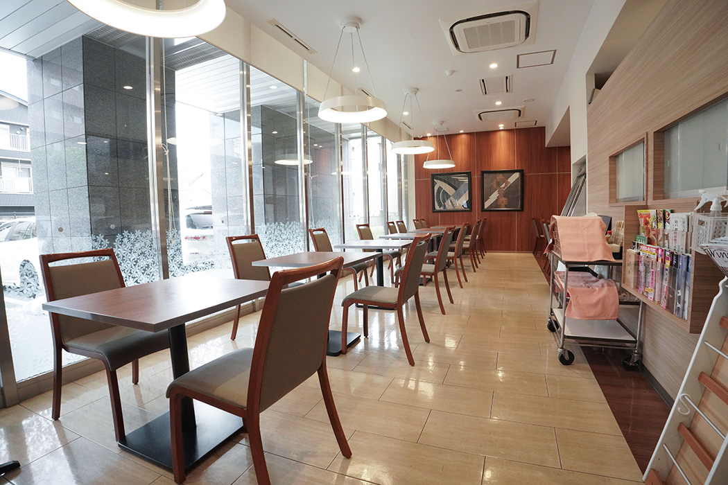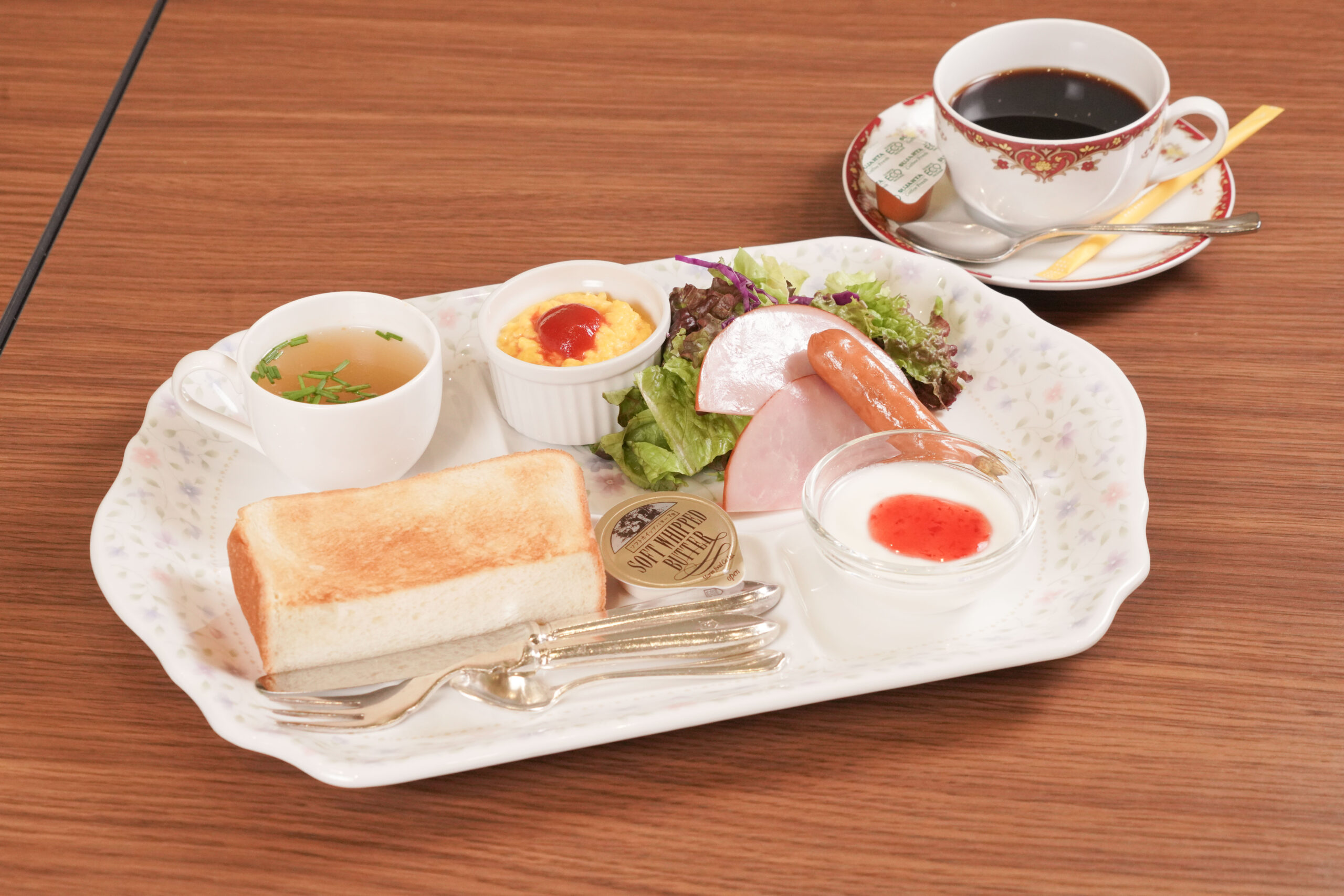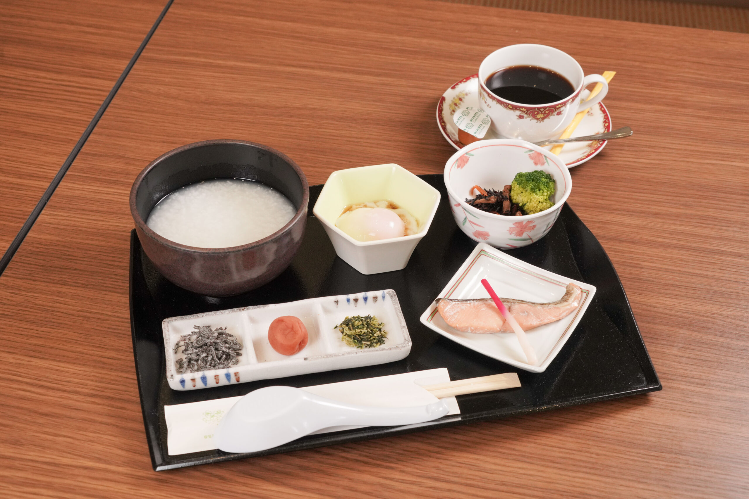 ●洋食モーニングセット トースト+スクランブルエッグ+サラダ+ハム+ソーセージ+ヨーグルト+コーヒー又は紅茶 ●和食朝粥セット お粥+小鉢+半熟たまご+焼き魚+お粥の付け合わせ3種+コーヒー又は紅茶