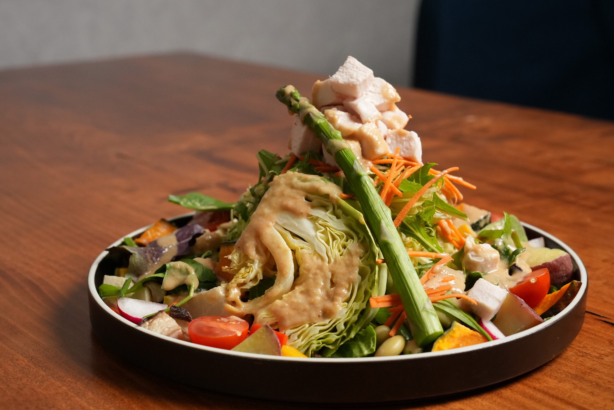 もともと食品事業より先に現在に至るまで繊維事業を行っており、オーナーの実家が長野県飯田市であるご縁から長野県から届いた減農薬・有機栽培で育ったお野菜を中心に砂糖不使用の体に優しいこだわりメニューを提供しています。その時々に届いた素材を使用するので季節によって提供されるお野菜が異なるのが当店の特色です。